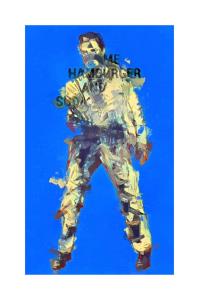 This is a Warholesque painting using the imagery of Elvis Presley going back into infinity. The painting entreats: Me [Elvis], Hamburger, and Soda.