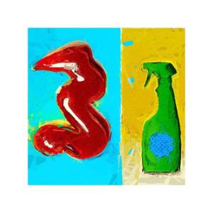 This painting is of 2 images the evoke the era of infomercials in which the "Product" can cure the stains of ketchup, blood, and iodine.