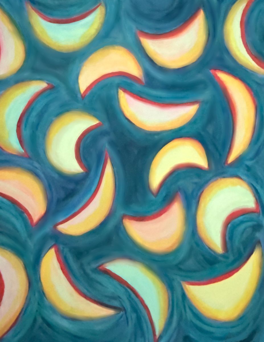 Soft crescent shapes drift across a foggy background, layered in pastel blends that never fully settle. There’s no clear light source, just an atmosphere—muted, dreamlike, and oddly comforting.
