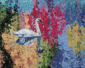 Original-Over Calm Waters was created during the Covid shut down. This Swan reminds us to relax and enjoy our surroundings and to take each day as it comes. Originally a quilt created of shreds of fabric and thread.