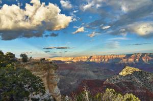 Cape Royal Point offers a dramatic view of the Grand Canyon with golden glazed clouds in a blue sky. Rays from the setting sun radiate from the horizon of rocky red cliffs of the canyon