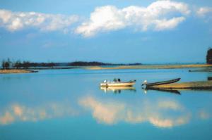 Clouds Reflect on Still Waters as Two Boats Wait For Their Owners in this Soft Blue pastel of a Carolina Lake