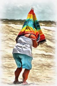 A Colorful Beach Scene of a Woman Being Swallowed By An Umbrella