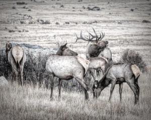 Bull elk bugling with grazing harem in a Rocky Mountain meadow.