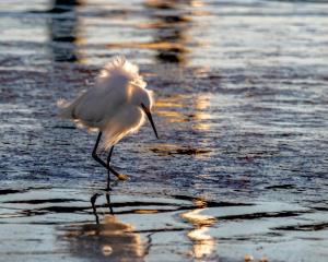 Snowy Egret strolls along the shorline at sunset on Rockport beach.