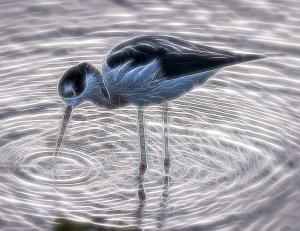 Software stylized photograph of a Red Legged Stilt drinking in a pond.