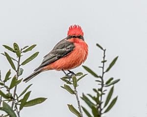 Stylized Vermillion Flycatcher perched on a treetop. Photograph stylized with software filters.