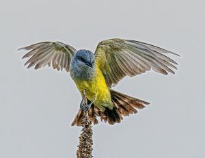 Stylized photo of flycatcher barely perched and poised for a meal.