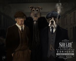 I love the Netflix show, The Peaky Blinders. The characters are fantastic. I had a vision of what the Shelby boys (Tommy, Arthur, and John) would look like as dogs. This is my illustration of the Shelby Dogs Ltd. of Small Heath, Birmingham. By order of the Peaky Barkers, designed and painted by artist Jonathan Carr.