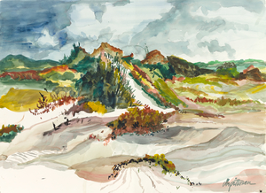 Dunes Under Overcast Original watercolor: 22"x30" Painted "en plein air" Padre Island could be considered a second home to Doris. She was comfortable painting in uncomfortable conditions and would spent hours capturing the dunes. The original watercolor, from which these fine art prints are made, is available for purchase. Please contact me if interested.