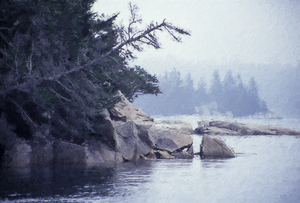 This is an image of a foggy morning on the tranquil coast of Maine. This is a digital painting created with Photoshop software from one of my original photographs.