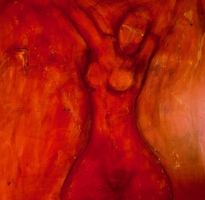 She glows! I teased out a striking female figure from the texture of acrylic on wood with charcoal. For this painting, I tried to let texture and color take the stage with the abstract figure playing a supporting role.