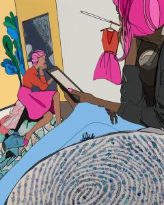 The way this work came about was somewhat spontaneous. I started with a physical collage of magazine cutouts, I thought about how people spend a lot of time alone, but communicating through social media or on their phones. At the same time, people seem to be increasingly isolated even when they are together. In this image, two female figures are portrayed in this artwork. While they occupy the same space, they don’t appear to be looking at each other. One is looking at a phone and the other has her eyes closed. A series of metaphorical openings serve as reflective surfaces as well as conduits for communication and passage. Conversely, both figures appear disconnected by an almost intractable space which is cluttered with a sea of clothes. Although neither figure appears to be connecting, they appear to be linked in another way, as indicated by the pink hair color, the dress, and the fingerprint. The primary color scheme simplifies the composition, allowing the viewer to focus on the symbolism embedded throughout the piece.