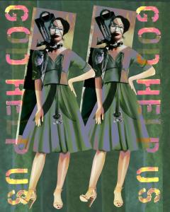 This work represents the ongoing struggle of living in Missouri as a woman. Presently, this state is at the forefront of legal challenges to women’s reproductive rights. Who gets to say how we govern our bodies: the government? God? Men? GOD HELP US symbolizes that women continue to struggle for autonomy over our bodies due to outside political, religious, and cultural forces. Two women in green dresses wearing high heels have their hands on their hips and look down their noses at the viewer. Diamond rings can be seen under their skirts. They appear to be tapping their toes. The words, “GOD HELP US” run vertically up and down the left and right sides of the composition. I chose the subject matter because the women appear boxed in by different elements. Green is for the green dresses the sellout women politicians wear when they serve the patriarchy against us and themselves. I wanted them to look bored and impatient because we know best what we need and we are tired of being a pawn in everybody’s else’s battle.