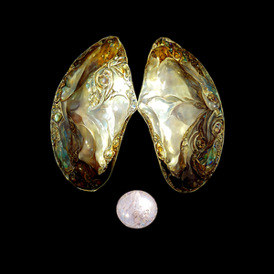 This is a rendering in the Art Nouveau style of an opened oyster shell, showing beautiful jeweled patterns within. A perfect lustrous pearl rests below the opened shell, with its own dancing shapes on the luminous surface.