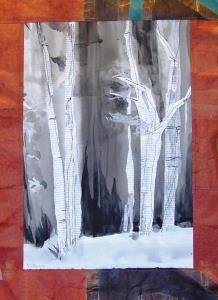 Frequent flooding of the Driftless Area has made much of this region undesirable for settlement. Luckily some forests have been left untouched; Created with brush and ink and collage papers added with machine sewing.