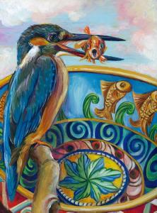 Acrylic on canvas by Nancy Polo. A cotton candy sky belies the deadly catch. The loveliest of them still has to eat or be eaten. #kingfisher #majolica #dreambig #hiddeninplainsight #acryliconcanvas