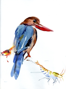 Watercolor on paper by Nancy Polo. Fishing for shrimp from the branch of a tree must be challenging. Kingfishers like to perch above the water waiting for their prey to show themselves.