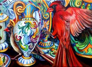This was painted for all those rare, beautiful birds hidden in plain site. The male cardinal swoops in for what he thinks will be fun and games, while the real gem remains hidden.