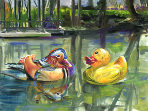 A Mandarin Duck encounters a well traveled, yellow rubber duck across the shadow of a tall tree on the surface of small wooded lake. A contemplation of memory, solitude, time and more, this painting is not just a couple of cute chicks looking at each other.