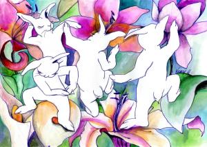 Artist Nancy Polo imagines some of her friends and cohorts as various animals... sometimes Bunnies. In this painting Bunny and her buddies are getting loose and letting it all manifest. Let go and enjoy. What will blossom will surprise you.