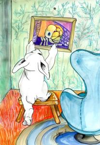 Artist Nancy Polo imagines some of her friends and cohorts as various animals... sometimes Bunnies. This painting is dedicated to creature comforts. Wouldn't anyone want deep orange shag grass, green carrot top wall paper, and large insects in their living room? Now that our homes are even more our castles, make it creatively yours.