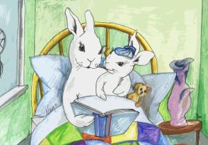 Artist Nancy Polo imagines some of her friends and cohorts as various animals... sometimes Bunnies. This painting is dedicated to all the parents who have nursed their little bunnies back to health with cuddles and stories.