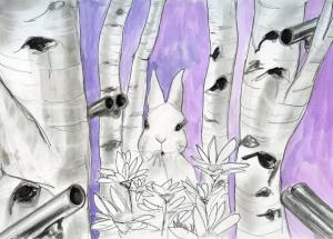 Artist Nancy Polo imagines some of her self, her friends and cohorts as various animals... sometimes Bunnies. This painting is dedicated to Elmer Fudd and all other intrepid, if misguided, hunters. All eyes are on this bunny, but she has some tricks in her.