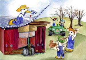Artist Nancy Polo imagines some of her self, her friends and cohorts as various animals: Ducks, Cranes, Dogs and sometimes Bunnies. This painting is dedicated to all the farm staff at Smith Meadows. It's never a boring day on a sustainable grass-based farm. In this scene Farmer Forrest Pritchard puts the finishing touches on one of many mobile egg laying stations that are moved like gypsy caravans on our farm from season to season.
