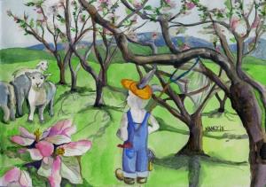 Artist Nancy Polo imagines some of her self, her friends and cohorts as various animals... sometimes Bunnies. This painting is dedicated to all our farm workers who have had to convince a sheep that the grass just might be greener on the other side of the fence. At Smith Meadows the sheep and cattle are usually eager to follow where we lead. The grass is lush and delicious all year round on our sustainable farm, but in May it is particularly spectacular.