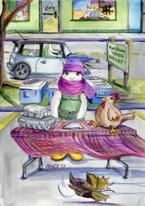 Artist Nancy Polo imagines some of her self, her friends and cohorts as various animals... sometimes Bunnies. This painting is dedicated to all of the hard working market staff of Smith Meadows. Without year-round markets, our sustainable farm business would not be possible, Without our dedicated town staff, it would be impossible.