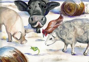 Artist Nancy Polo imagines some of her friends and cohorts as various animals... sometimes Bunnies. This painting is dedicated to the cattle, sheep, pigs and laying hens who make possible our life at Smith Meadows on historic Smithfield Farm in Berryville, VA. WIinter on a pasture based farm can get us all excited about the coming spring.