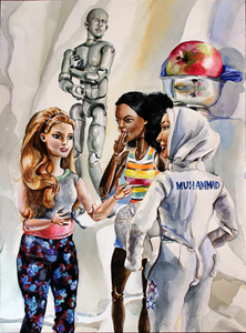 Based on Watercolor on paper by Nancy Polo. Three women are having a conversation. In the background are a male figure, and a Pink Lady Apple. This is based on the myth regarding the start of the Trojan War. The goddess of discord, Eris, threw an apple into the reception of Peleus, and the sea nymph Thetis' wedding, as revenge for not being invited. The golden apple was inscribed with the words "For the Fairest". Paris was selected by the gods to settle a dispute between the three goddesses: Athena, Hera and Aphrodite- Who is the Fairest? In this painting, it is not clear if the "women"/dolls are even concerned with the "male figure" in the background. It could be that they are just talking to each other.