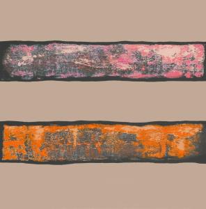 The original oil painting is approx 20" x 20". Layers of paint create these ethereal stripes, one pink one orange.