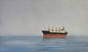 Wellington harbour, low lying mist, fog on a still day with a solitary tanker waiting patiently for the tug boats to arrive. An ethereal moment in time.