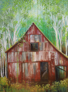 Rustic barn painting with large trees surrounding. Tall weeds and wildflowers in the foreground.