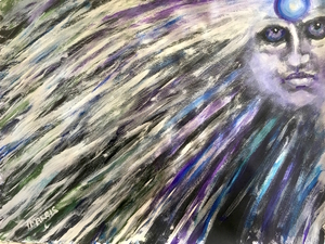 This painting started with the inspiration to experiment with iridescent and pearlescent paints on a black background. The face appeared at the very last, fixing me with an intense star gaze.