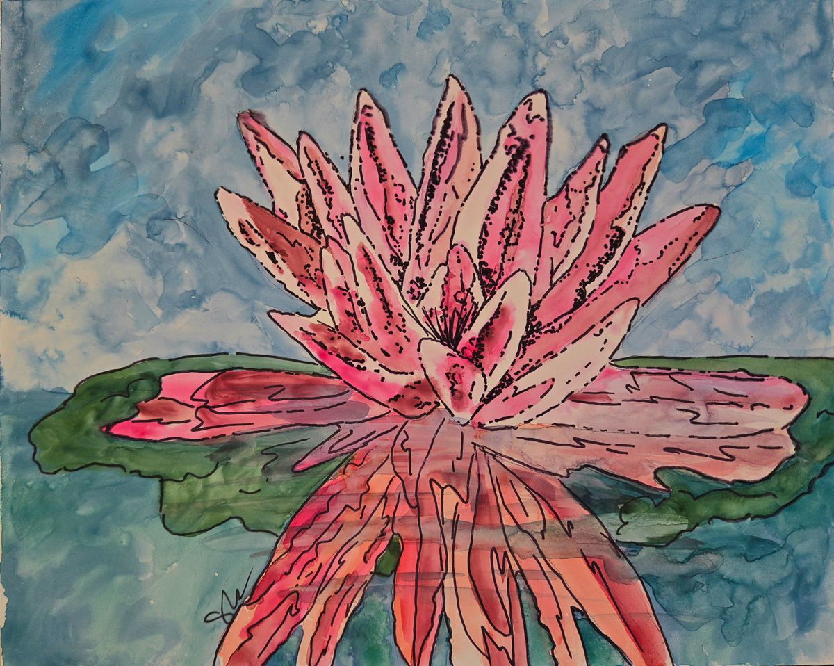 This painting was made by using watercolor paint and marker. The colors seem to swirl together throughout the painting. The flower has various shades of pink, the lily pad has greens, and the background has various blues. Water lilies are one of the birth flowers for July.