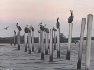 Pelicans on Lake Catherine is an oil on panel painting of a still shot taken from a video of the pelicans on Lake Catherine in Louisiana