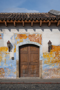 Clay tile roof. Blue, yellow, orange and white textured wall. Rustic wooden door. Cobblestone street. Quintessential Antigua, Guatemala architecture.