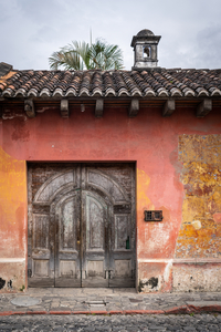 What a beautiful rustic door in Antigua, Guatemala. The cobblestone street, wooden beams, clay tile roof and rich red and yellow colors on the shabby chic wall are classic Central American colonial signature architecture styles.
