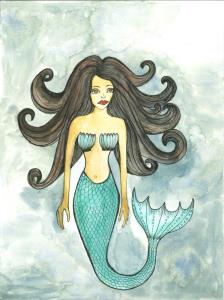 This dreamy mermaid is painted with watercolors and ink on paper.